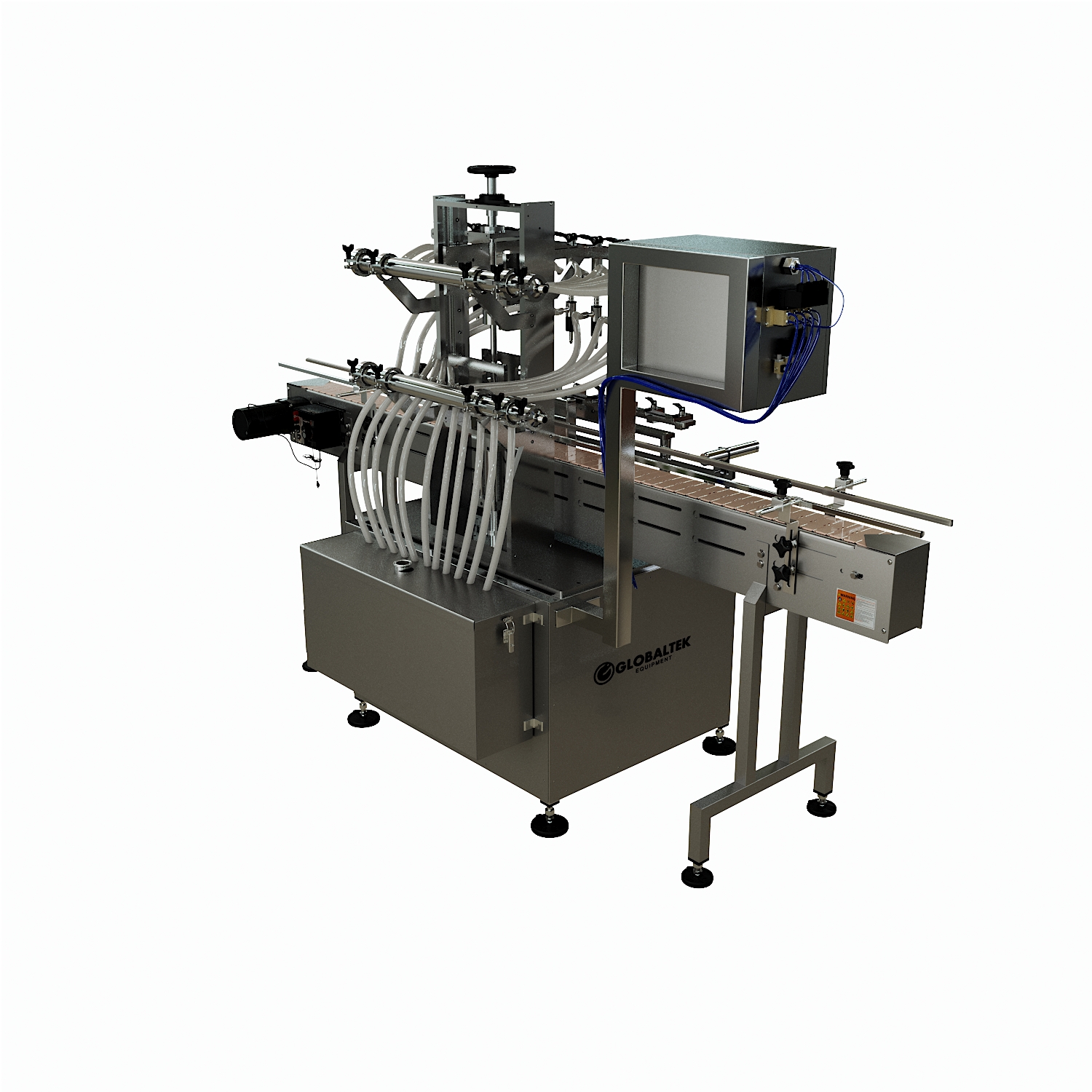 The GLOBALTEK™ Automatic Overflow Fill-It is a unique piece of packaging equipment that fills every bottle to the same level, regardless of the interior volume of the individual containers. This equipment fills containers using a nozzle that overflows product back into a holding tank once the liquid reaches desired level in the container. The Fill-It uses indexing and a PLC to allow for continuous bottle filling without the need of an operator for each cycle.